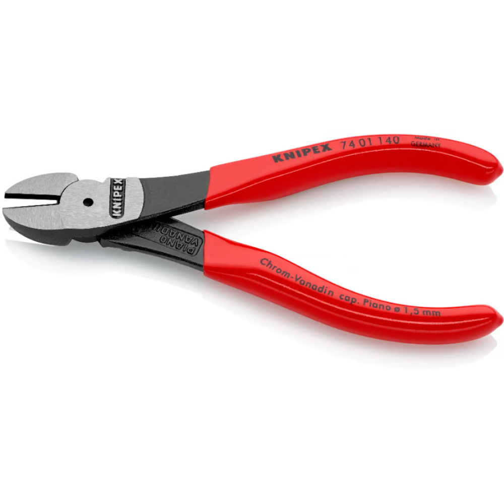 Бокорезы особой мощности KNIPEX 74 01 140 KN-7401140 Особенности - Экономия усилия 20% - Ось шарнира накована Описание - Для самых высоких продолжительных нагрузок - Высокая режущая способность при меньшем расходе усилий благодаря оптимальному согласованию угла режущих кромок, передаточного отношения рычагов и эргономической конструкции ручек - Прецизионные режущие кромки дополнительно закалены токами высокой частоты, твердость режущих кромок примерно 64HRC - Хромованадиевая высококачественная сталь, кованая, закалённая в масле Параметры режима резания - Проволока средней твердости Ø 3,1 мм - Твердая проволока Ø 2,0 мм - Рояльная струна Ø 1,5 мм Характеристики - Черненые, полированные - Пластмассовые чехлы - Длина 140 мм - Вес 131 г