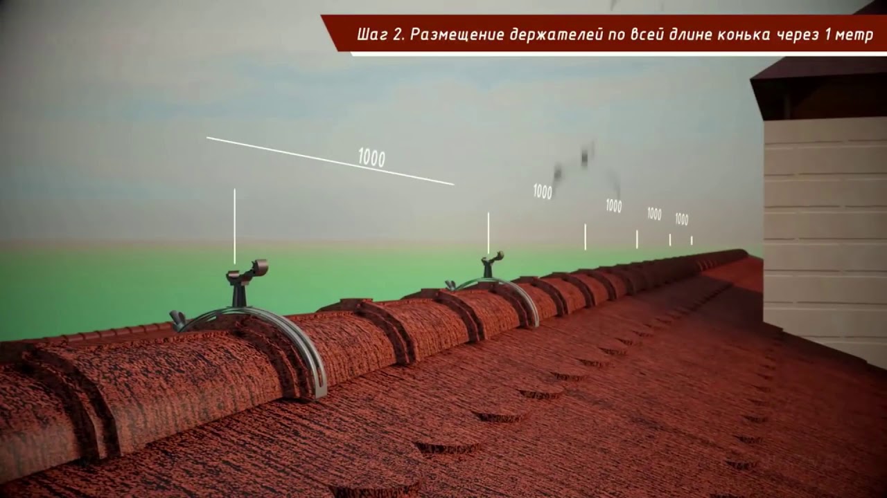 Установка держателей на круглый конек производится непосредственно на его поверхность. Коньки крыши имеют различную поверхность, поэтому в держателях предусмотрена несложная регулировка хвата по диаметру. Крепеж к коньку обеспечивается наличием у держателей специальных усиков, размещенных внизу конструкции. Эти усики достаточно завести под край поверхности конька, что обеспечит надежную фиксацию.