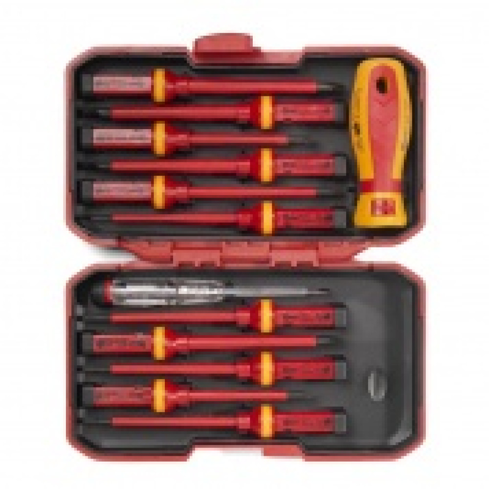 - Состав набора: - диэлектрическая бита: шлиц 3.0 х 100 - диэлектрическая бита: шлиц 4.0 х 100 - диэлектрическая бита: шлиц 5.5 х 100 - диэлектрическая бита: шлиц 6.5 х 100 - диэлектрическая бита: PH 1 х 80 - диэлектрическая бита: PH 2 х 100 - диэлектрическая бита: PZ 1 х 80 - диэлектрическая бита: PZ 2 х100 - диэлектрическая бита: Т10 х 100 - диэлектрическая бита: Т15 х 100 - диэлектрическая бита: Т20 х 100 - тестер напряжения 110–250 В - диэлектрическая рукоятка для сменных бит - Для работы под напряжением до 1000 В - Материал стержня биты: хром-ванадиевая сталь - Вороненые намагниченные наконечники - Материал изоляции биты: полипропилен - На каждой бите — маркировка типоразмера - Двухкомпонентная рукоятка с мягкими вставками из термопластрезины - Патентованный пружинный механизм фиксации биты в рукоятке - Упаковка: прочная раскладывающаяся сумка с широкой застежкой-липучкой - Вес набора: 840 г - Габариты кейса: 220х135х50 мм ➔Эксплуатационные характеристики (лет) - Гарантийный срок хранения: 10 - Гарантийный срок эксплуатации: 5 [ https://techelectro.ru/images/products/vdetools/screwdriver.png ]
