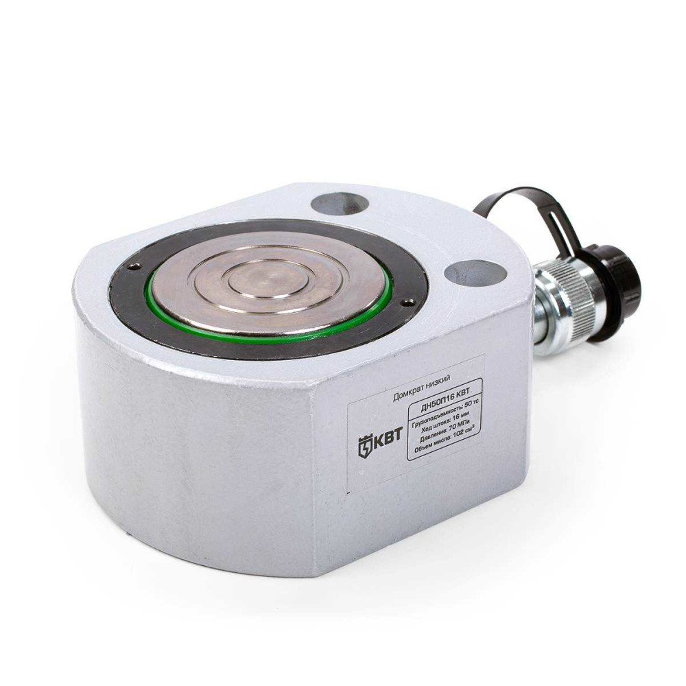 Модель товара <ДН50П16 - Предназначены для использования в ограниченном пространстве при монтаже и выверке тяжелого оборудования, для выравнивания пролетов мостов - В комплекте: - домкрат грузовой ДН50П16 - ремкомплект (уплотнительные кольца) - Базовые характеристики: - Грузоподъемность: 50тс - Ход поршня: 16мм - Объем масла: 102мл - Высота: 66мм - Максимальное давление: 700 бар (70МПа) - Диапазон рабочих температур: -15…+50°С - Пружинный возврат штока - Высокопрочная опора из закаленной стали, установленная на шток предохраняет его от повреждения - Рифленая поверхность опоры предотвращает скольжение груза - Износостойкое покрытие корпуса наносимое методом порошковой окраски - Совместимость: любые гидравлические насосы «КВТ» с объемом рабочей жидкости не менее двойного объема домкрата - Вес: 6.28кг - Габариты упаковки: 210х120х75мм