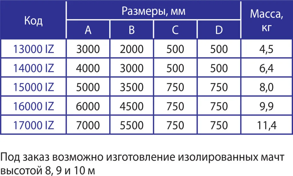 - Индивидуальное производство: Под заказ доступны мачты высотой 8, 9 и 10 метров,что делает продукт универсальным для объектов с особыми требованиями.