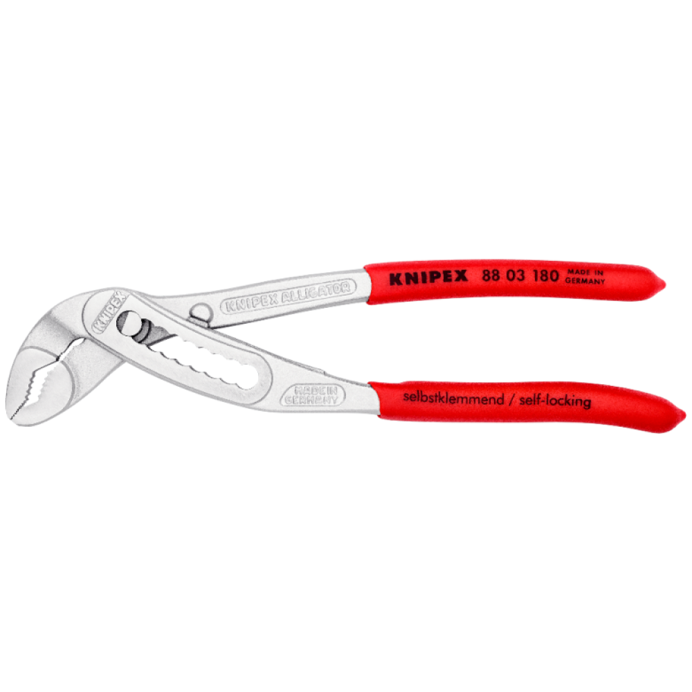 Клещи сантехнические Alligator ®, 250 мм, KNIPEX 88 02 250T KN-8802250T Описание - Больше производительности и удобства в работе по сравнению с обычными сантехническими клещами аналогичной длины: 9-ступенчатая регулировка и увеличенная на 30 % захватывающая способность. - Хороший доступ к детали благодаря тонкой конструкции в области головки и шарнира. - Функция смыкания губок, которая облегчает работу в узких и труднодоступных местах. - Самофиксируются на трубах и гайках: нет скольжения по детали, работа без утомления. - Захватные губки со специально закаленными зубцами, твердость зубцов примерно 61 HRC: надежный захват при высокой износостойкости. - Коробчатый шарнир: высокая стабильность благодаря двум направляющим. - Прочная конструкция, устойчивы к загрязнениям; особенно подходят для работ вне помещения. - Специальный механизм предотвращает случайное защемление пальцев. - Хромованадиевая электросталь, кованая, закалённая в масле. Модель 88 02 250Т : - С креплением для страховки от падения с высоты. Нагрузка на проушину до 400 N - С длинными ручками в двухцветных многокомпонентных чехлах без упоров - для большего удобства в использовании и более простой транспортировки. - Внимание! Пружинный провод-держатель с карабином и петлей в комплект не входит. [ https://mvgrp.ru/wp-content/uploads/2017/01/opisanie_alligator.png ] Диапазон зажима - Для труб 2" / 50 мм - Размер под ключ 46 мм Количество позиций установки - 9 Характеристики - Черненые, полированные - Двухкомпонентные чехлы - Крепление для страховки - Длина 250 мм - Вес 357 г