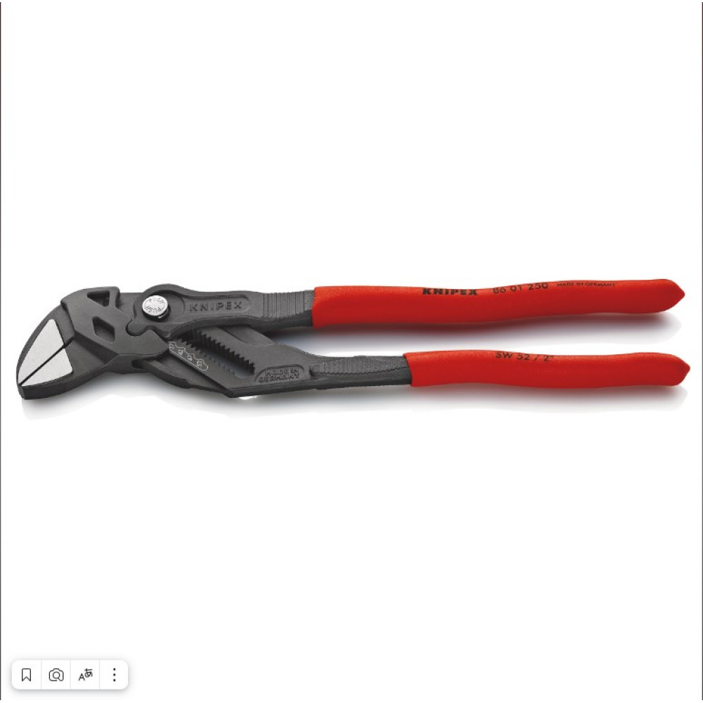 Клещи переставные-гаечный ключ, 250 мм, KNIPEX 86 05 250T KN-8605250T Особенности - Инструмент с креплением для страховки от падения с высоты.  - Нагрузка на проушину до 400 N Описание - Заменяют полный набор гаечных ключей, как метрических, так и дюймовых. - Гладкие губки для бережного монтажа арматуры с высококачественной отделкой поверхностей - работа непосредственно с хромированными материалами. - Регулируемый инструмент для работы с винтовыми соединениями. - Также отлично подходят для захвата, фиксации, опрессовки и гибки деталей. - При монтаже деталей с высококачественной отделкой они не повреждаются благодаря плотному прилеганию инструмента по всей поверхности. - Регулировка прямо на детали простым нажатием кнопки. - Бесступенчатая установка нужного размера ключа в рабочем диапазоне за счет параллельного хода губок. - Надежная фиксация винта шарнира: случайная перестановка исключается. - Зазор между захватными плоскостями позволяет быстрое заворачивание и отворачивание винтовых соединений по принципу трещоточного ключа. - Высокое усилие фиксации с помощью 10-кратного увеличения передачи усилия. - Хромованадиевая электросталь, кованая, закалённая в масле. - Внимание! Пружинный провод-держатель с карабином и петлей в комплект не входит. [ https://mvgrp.ru/wp-content/uploads/2016/12/knipex_opicanie.png ] Диапазон зажима - Размер под ключ 1 3/4" / 46 мм Количество позиций установки - 17 Характеристики - Никелированные - Двухкомпонентные чехлы - Крепление для страховки - Длина 250 мм - Вес 570 г [ https://mvgrp.ru/wp-content/uploads/2016/12/opicanie_250.png ]