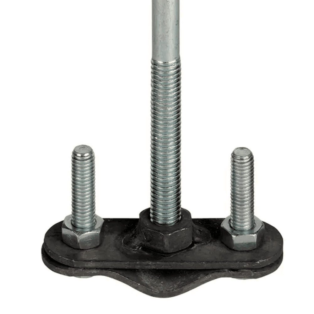 Крепление состоит из двух пластин, верхняя из которых имеет скругленный паз. Мачта протягивается в этот паз, после чего пластины прижимаются друг к другу с помощью стяжных болтов. Держатели покрыты цинком для защиты от непогоды.