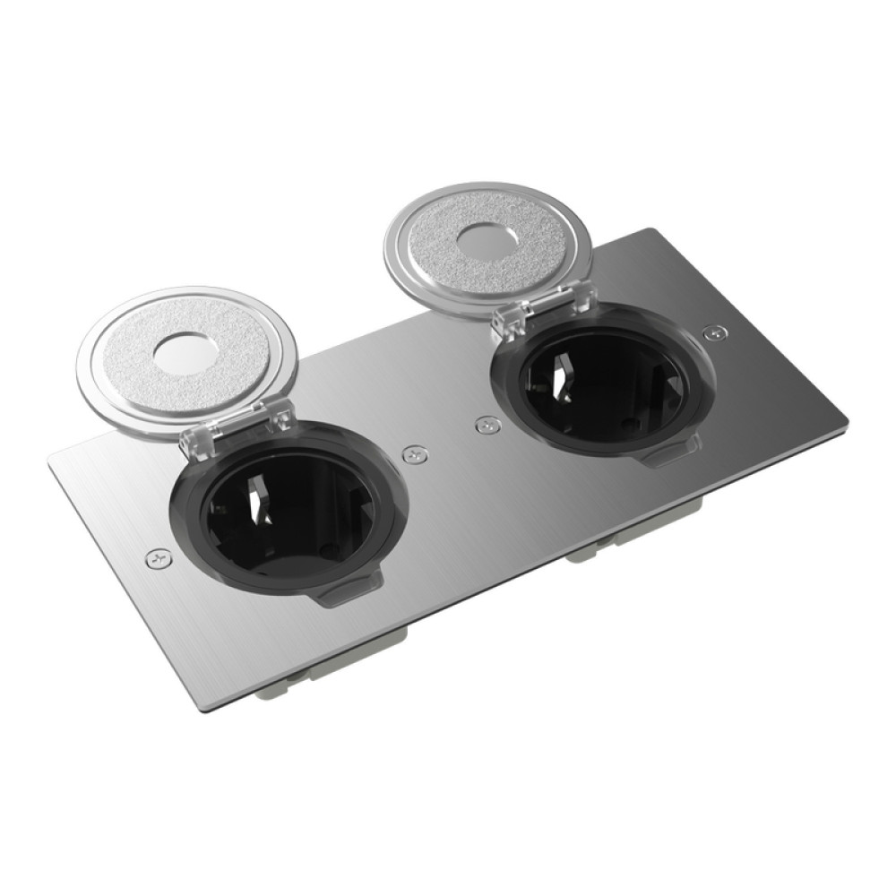 Напольные лючки Donel – решение для организации рабочих мест, как в открытых пространствах типа «Open Space», так и в индивидуальных помещениях и комнатах переговоров.Предназначены для монтажа модульных электроустановочных изделий 45х45 мм в плиты фальш-пола или в бетонный пол.- Степень защиты от влаги и пыли IP44- Степень защиты от ударов IK09- Установка заподлицо с напольным покрытием (при установке в стяжку)- Возможность установки составного блока из нескольких лючков (для отдельного типа лючков)ВНИМАНИЕ! Степень защиты IP44 возможна только при полностью закрытой крышке лючка, при этом не допускается никаких внешних подключений к электроустановочным модулям, установленным в лючке.В комплект поставки установочная коробка для фальш-пола и коробка для стяжки не входит и приобретается отдельно.Электроустановочные изделия, слаботочные и мультимедийные разъемы стандарта 45х45 в комплект поставки не входят и приобретаются отдельно.- для монтажа в бетонную стяжку использовать установочную коробку DFB22MRBCF в комплект поставки не входит и приобретается отдельно.- для монтажа в плиты фальш-пола использовать установочную коробку DFB22MRBFF в комплект поставки не входит и приобретается отдельно.