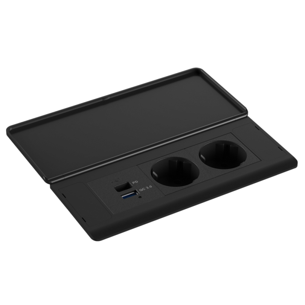 Настольный встраиваемый розеточный блок с откидной крышкой DDSB6FPB- решение для организации подключения к электропитанию открытых офисных пространств, комнат переговоров, конференц-залов, гостиничных номеров, индивидуальных рабочих мест home office.ВНИМАНИЕ!!! Электроустановочные изделия, слаботочные и мультимедийные разъемы стандарта 45х45, а так же кабель для подключения в комплект поставки не входят и приобретаются отдельно.