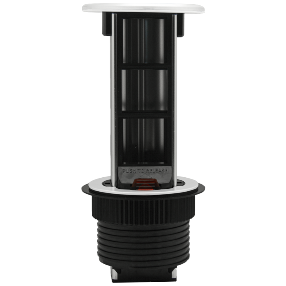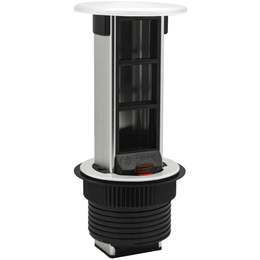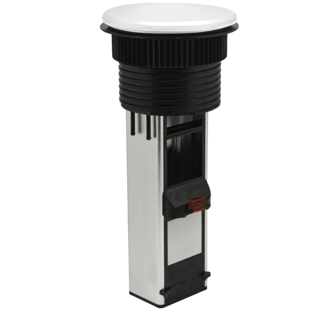 Настольный встраиваемый выдвижной розеточный блок Vertical - решение для организации подключения к электропитанию не только комнат переговоров, открытых офисных пространств, конференц-залов, гостиничных номеров, но и домашних (кухонных) пространств и индивидуальных рабочих мест home office.Верхняя крышка с классом защиты IP54 в закрытом положении обеспечивает надежную защиту от проникновения воды и пыли.Степень защиты IP54 возможна только при полностью закрытом положении, при этом не допускается ни каких внешних подключений к электроустановочным модулям, установленным в блоке.Электроустановочные изделия, слаботочные и мультимедийные разъемы стандарта 45х45, а так же кабель для подключения в комплект поставки не входят и приобретаются отдельно.