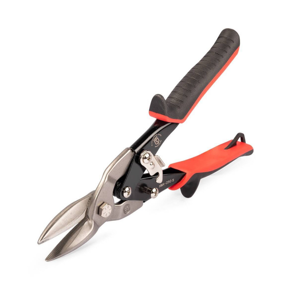Ножницы прямого типа 250 мм для резки листового металла Серия ПРОФИ модель: НМА-250 S - Предназначены для прямого реза листовой низкоуглеродистой, нержавеющей стали, тонкостенных металлических профилей и профнастилов - Резка листовой низкоуглеродистой стали до 1,2 мм - Резка листовой нержавеющей стали до 0,7 мм - Материал лезвий: хром-молибденовая сталь - Мощный рычажный механизм обеспечивает эффективный и точный рез - Насечки на лезвиях предотвращают проскальзывание при резке - Двухкомпонентные рукоятки с упором под пальцы - Отверстие для подвешивания на рукоятке - Блокиратор рукояток - Возвратная пружина - Вес инструмента: 390 г - Длина инструмента: 250 мм Эксплуатационные характеристики Гарантийный срок хранения 5 лет Гарантийный срок эксплуатации 1 год Срок службы  3 года SKU товарные позиции Тип инструмента Вид инструмента Разрезаемый материал Максимальный рез (мм) Длина инструмента, мм 102040 НМА-250 S серия ПРОФИ ножницы ручной стальная лента/листовая сталь/кабельный короб 1.2 250