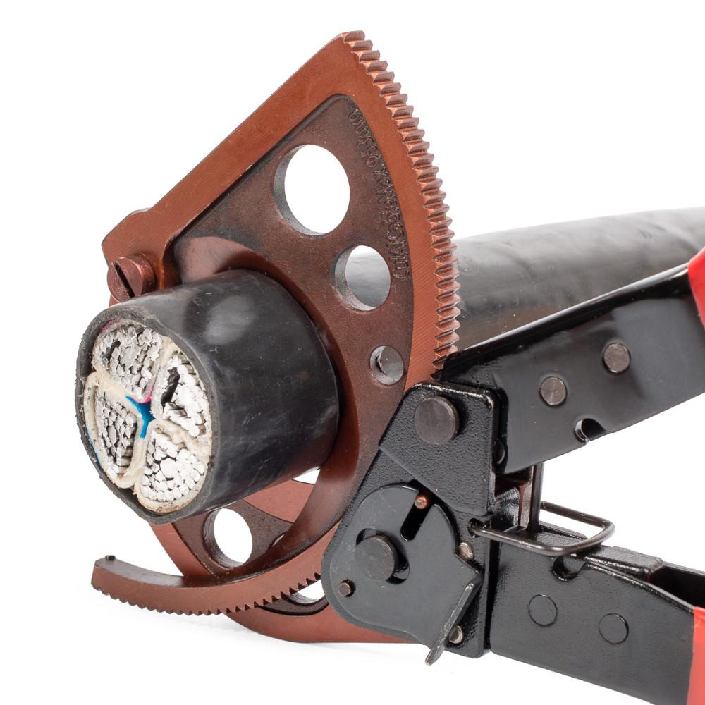 Секторные ножницы для резки бронированных кабелей ∅ до 53 мм ∅ до 53 мм Серия ПРОФИ модель:  НС-53 - Диапазон резки: - кабели с ленточной броней ∅ до 53 мм - телефонные кабели ∅ до 53 мм - Специальная термообработка лезвий - Твердость лезвий HRC 48...52 - Усовершенствованная конструкция - Надежный храповой механизм - Функция разблокировки лезвий из любого положения - Блокиратор рукояток - Не предназначены для резки стальных тросов - Вес: 940 г - Длина: 275 мм Эксплуатационные характеристики [ https://kvt.su/prod/electrical-tools/cutters/sectioncutters/ns53/#collapse1-operation-characteristics ] Гарантийный срок хранения 5  лет Гарантийный срок эксплуатации 1  год Срок службы 3  года SKU товарные позиции Тип инструмента Вид инструмента Разрезаемый материал Диаметр резрезаемого кабеля, max (мм) Длина инструмента, мм 55942 НС-53 серия ПРОФИ [ https://kvt.su/prod/electrical-tools/cutters/sectioncutters/ns53/sku_55942/ ] ножницы секторный ленточная броня/ алюминиевый кабель/ медный кабель 53 275