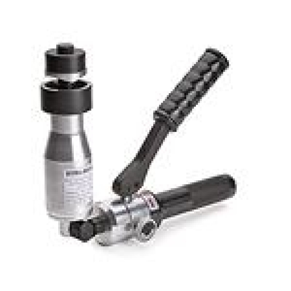 Пресс гидравлический ручной поворотный ПГРОп-60А (КВТ) - Состав комплекта: - гидравлический поворотный пресс ПГРОп-60А - набор из 8 сменных перфоформ - 2 резьбовые шпильки ∅ 10/20 и ∅ 20 мм - опорная втулка - 1 запасная резьбовая шпилька ∅ 10/20 мм - ремкомплект (уплотнительные кольца) - прочный пластиковый кейс - Диаметр пробиваемых отверстий (мм): 16.2/18.6/20.5/22.5/25.4/28.3/37.0/47.0 - Каждая перфоформа представлена парой: матрица – пуансон - Толщина стального листа (St 37): до 3 мм - Три степени свободы узла крепления головы - Максимальное усилие: 10 т - Инструмент имеет минимальный вес и габариты благодаря новой конструкции и специальному алюминиевому сплаву, из которого изготовлен корпус инструмента - Вес комплекта/инструмента: 6.00/2.10 кг - Габариты кейса: 445x300x95