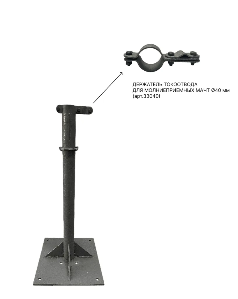 Подставка предназначена для крепления мачты молниеприемника на горизонтальных поверхностях. Зажим подключения проводника арт. 33040. предназначен для соединения молниеприемной мачты 5-12 м с токотводом 8-10мм.