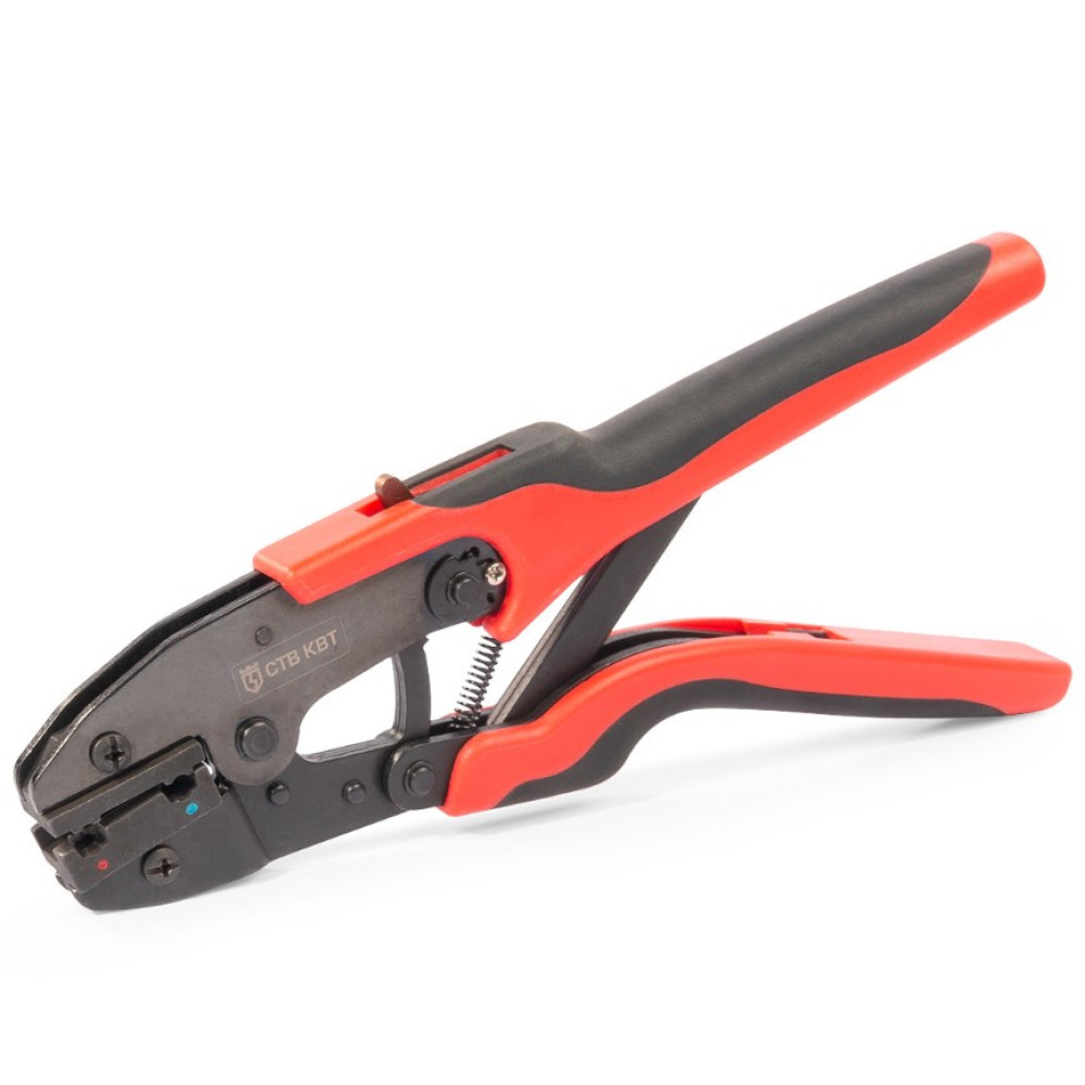 Кримпер для обжима флажковых разъемов в нейлоновом корпусе Модель: CTB-09 - Опрессовка флажковых разъемов в нейлоновом корпусе РФИ-М(н) сечением 0.25-2.5 мм² профиль обжима овальный двухконтурный - Двухпозиционная матрица - Профиль обжима: овальный, одноконтурный - Усиленный трехшарнирный рычажный механизм - Материал корпуса: качественная 3-х миллиметровая сталь - Удлиненные рукоятки, позволяющие производить опрессовку двумя руками - Храповой механизм, обеспечивающий блокировку обратного хода до завершения полного цикла опрессовки - Устройство разблокировки храпового механизма - При работе требуют на 30% меньше усилий, чем аналогичный инструмент - Рельефные двухкомпонентные рукоятки из нескользящей термопластрезины - Регулятор прижимного усилия матриц - Совершенные эргономичные пропорции - Обработка поверхности: воронение - Вес: 620 г - Длина: 260 мм Эксплуатационно-гарантийные сроки - Гарантийный срок хранения 5  лет - Гарантийный срок эксплуатации 1  год - Срок службы 3  года 75827 CTB-09 (КВТ) пресс-клещи ручной сменная изолированные наконечники и гильзы Опрессовка флажковых разъемов в нейлоновом корпусе РФИ-М(н) сечением 0.25-2.5 мм² овальный двухконтурный сменные матрицы/ возможность использования матриц МПК/ храповой механизм/ механизм разблокировки/ регулятор прижимного усилия/ удлиненные рукоятки 260