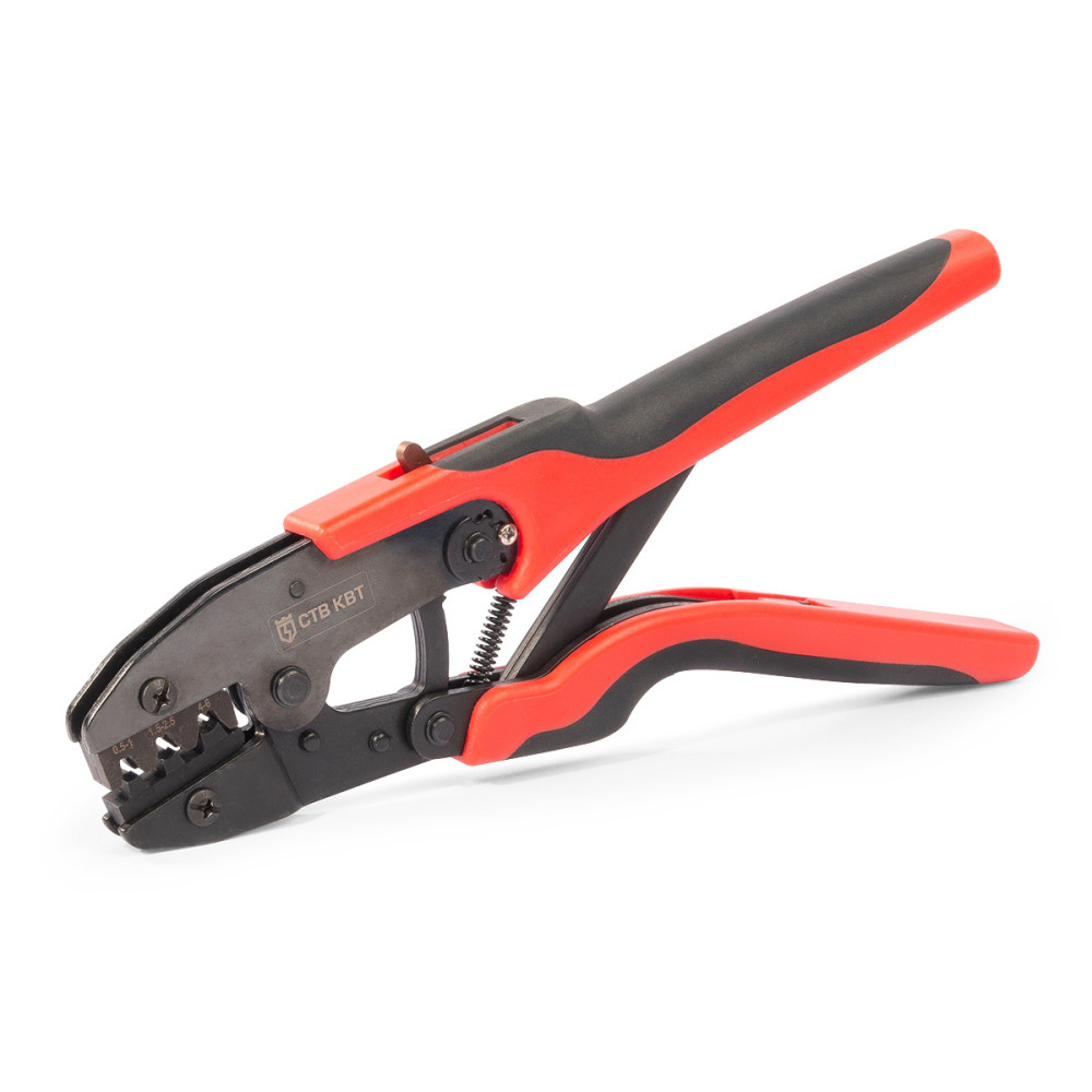 Кримпер для обжима автоклемм сечением 0.5-6 мм Модель: CTB-14  - Опрессовка неизолированных разъемов и наконечников (автоклемм) под двойной обжим - Типы наконечников:  - РП-М РП-П [ https://mti.by/catalog/izolirovannye-nakonechniki-i-gilzy-razemy-otvetviteli-neizolirovannye-avtoklemmy/razemy-neizolirovannye-avtoklemmy-rp-p-rp-m/ ] - Сечения проводов: 0.5/0.75/1.0/1.5/2.5/4/6 мм² - Трехпозиционная матрица - Профиль обжима: лепестковый, двухконтурный - Усиленный трехшарнирный рычажный механизм - Материал корпуса: качественная 3-х миллиметровая сталь - Удлиненные рукоятки, позволяющие производить опрессовку двумя руками - Храповой механизм, обеспечивающий блокировку обратного хода до завершения полного цикла опрессовки - Устройство разблокировки храпового механизма - При работе требуют на 30% меньше усилий, чем аналогичный инструмент - Рельефные двухкомпонентные рукоятки из нескользящей термопластрезины - Регулятор прижимного усилия матриц - Совершенные эргономичные пропорции - Обработка поверхности: воронение - Вес: 620 г - Длина: 260 мм Эксплуатационно-гарантийные сроки Гарантийный срок хранения 5  лет Гарантийный срок эксплуатации 1  год Срок службы 3  года SKU товарные позиции Тип инструмента Управление Коннекторы Краткая характеристика Профиль обжима Особенности конструкции Матрицы в комллекте Длина инструмента, мм 55910 CTB-14 (КВТ) пресс-клещи ручной наконечники из листовой меди Опрессовка неизолированных разъемов и наконечников (автоклемм) под двойной обжим по жиле и изоляции РП-М, РП-П сечением 0.5-6 мм² лепестковый двухконтурный сменные матрицы/ возможность использования матриц МПК/ храповой механизм/ механизм разблокировки/ регулятор прижимного усилия/ удлиненные рукоятки        ✅ 260
