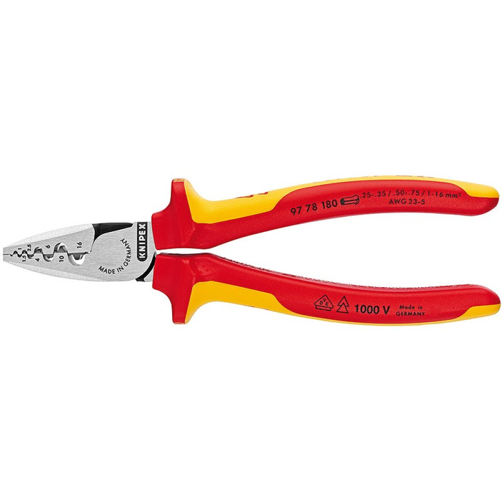 Пресс-клещи для обжима контактных гильз VDE 1000V, кол-во гнёзд: 9, 0.25 - 16.0 мм (AWG 23 - 5), L-180 мм, 2-комп. рукоятки (KNIPEX)
