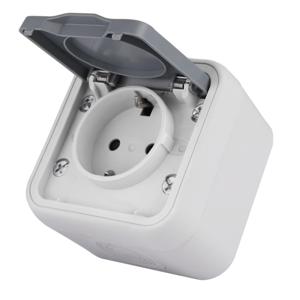 Розетка 1-я с защитной крышкой, 2К+З и шторками, накладная, цвет серый, IP55, серия W55
