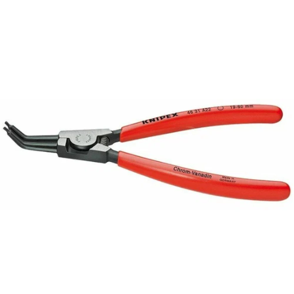 Щипцы для внешних стопорных колец, губки 45°, L-185 мм, Cr-V, чёрные, обливные рукоятки (KNIPEX) Технические особенности модели KN-4631A22: - Корпус и высокопрочные нескользящие наконечники клещей изготовлены из хромованадиевой инструментальной стали особого качества, кованой и многократно закаленной в масле для прочности и долговечности; - Захватные губки конусной формы загнуты под углом 45° для удобства при монтаже стопорных колец на оси в труднодоступных местах; - Надежный шарнир обеспечивает исключительно ровный и плавный ход во время работы; - Встроена автоматически раскрывающая пружина; - Используются для монтажа стопорных колец в отверстиях валов диаметрами от ⌀ 19 до ⌀ 60 мм; - Диаметр наконечников составляет ⌀ 1,8 мм; - Покрытие черненое с полированной головкой, устойчивое к образованию коррозий; - Длина инструмента 185 мм, общий вес всего 133 гр. - Эргономичные дугообразные рукоятки вложены в плотные алые чехлы, изготовленные методом погружения из высококачественного пластика повышенной износостойкости. Рукоятки удобно лежат в руке, исключая выскальзывание. - Компания KNIPEX применяет новейшие технологии и инженерные решения в производстве профессиональных инструментов для постоянной работы.