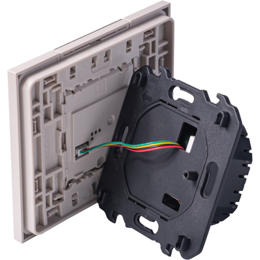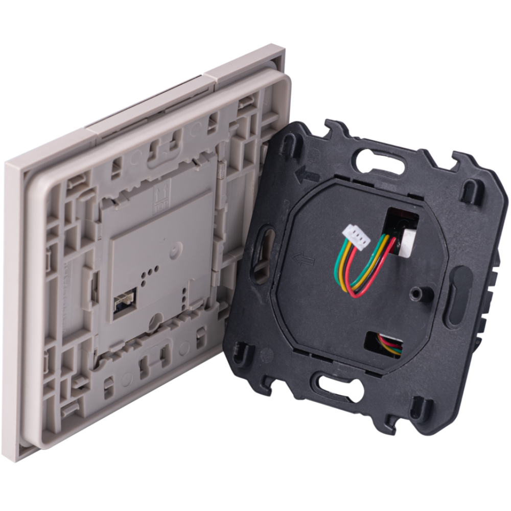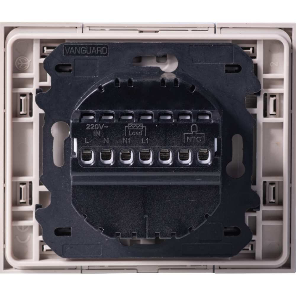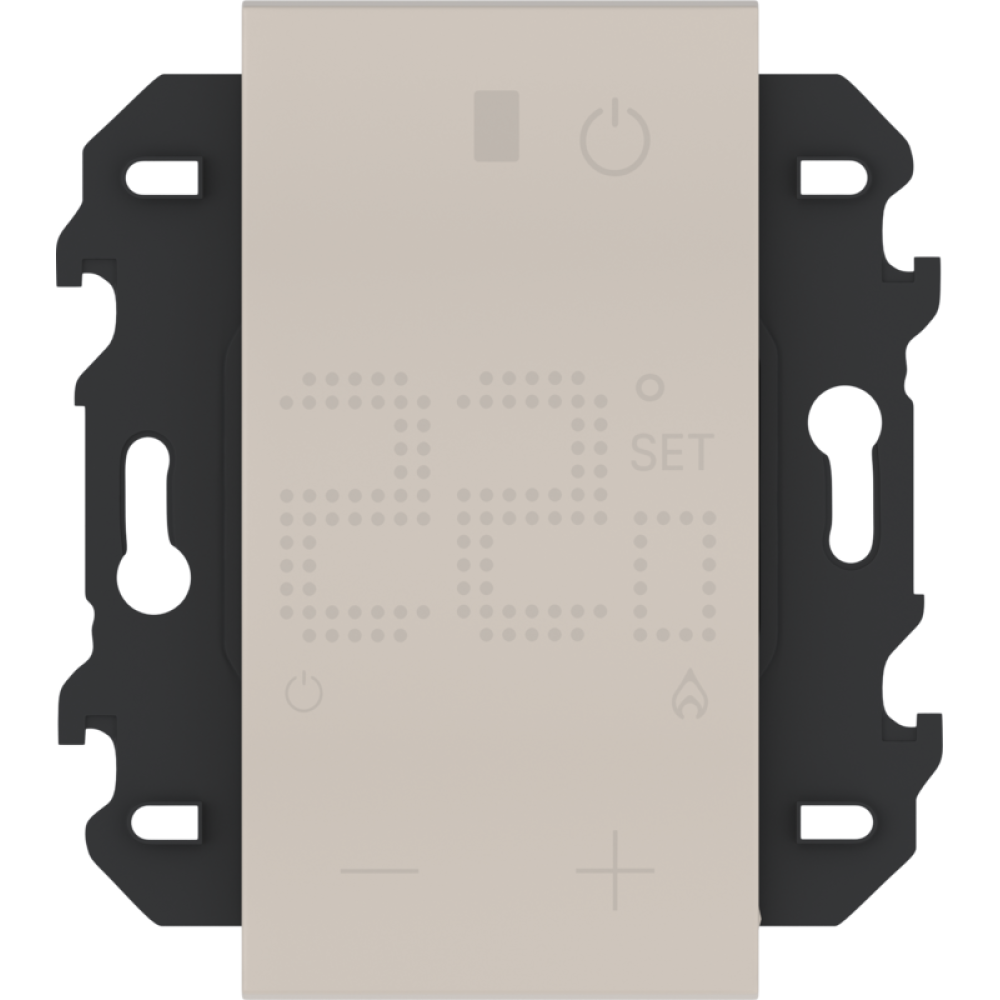 Термостат для тёплых полов в песочном цвете от Vanguard Valero совмещает функциональность и стиль. Выносной датчик обеспечивает точное поддержание температуры, а дисплей и сенсорные кнопки управления позволяет легко настроить параметры. Работает на 230В с током до 16А и занимает 2 модуля. Песочный цвет добавляет уют и теплоту в интерьер. Поставляется с интегрированным суппортом 2 модуля. Только для установки в рамки немецкого стандарта.